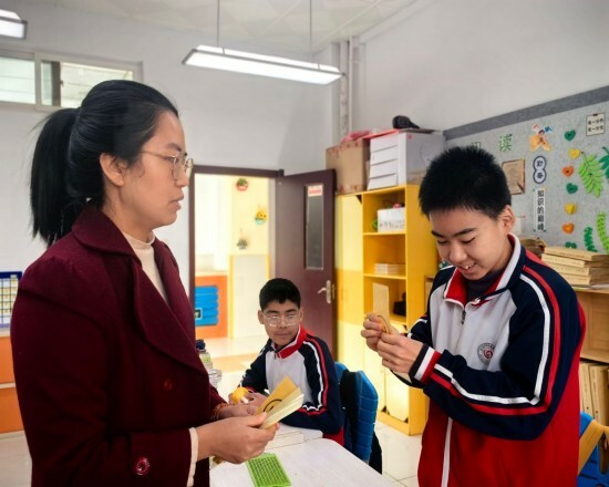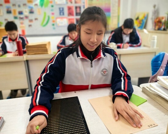 视障班赛场,指尖与盲文板的触碰声奏响独特竞技旋律。虹辉一年级学生通过扎盲文点位、抢答 10 以内加减法参与比拼,指尖精准跳跃,将数字与运算符号转化为触摸记忆,筑牢数感基础;五年级学生沉稳应对盲文试卷,从容完成基础运算与简单解决问题题型,彰显日常积累;九年级抽题抢答环节紧张激烈,同学们聚精会神聆听提示,即刻应答,既考计算速度与准确率,更践行课标 “培养实际问题解决能力” 的核心目标。
