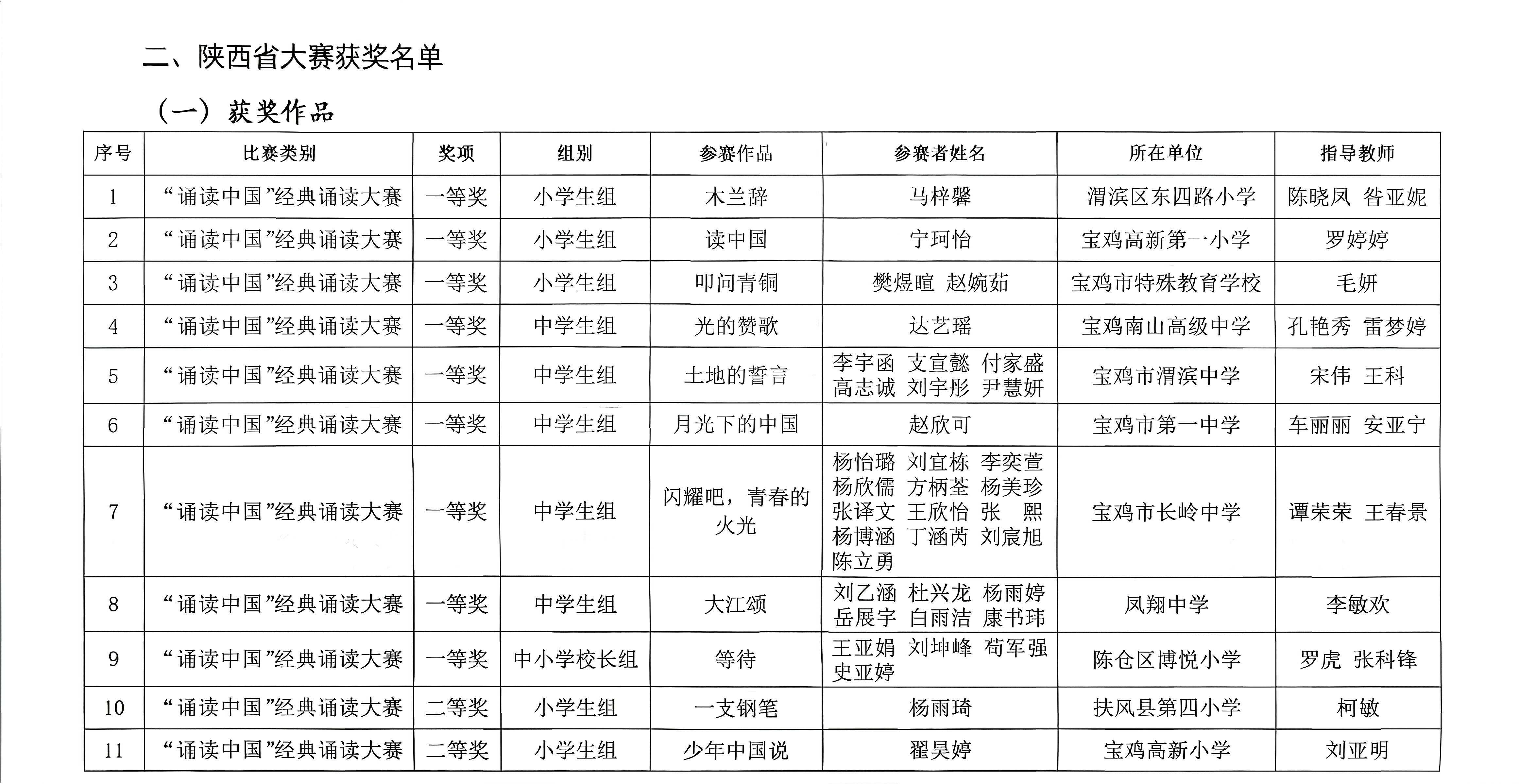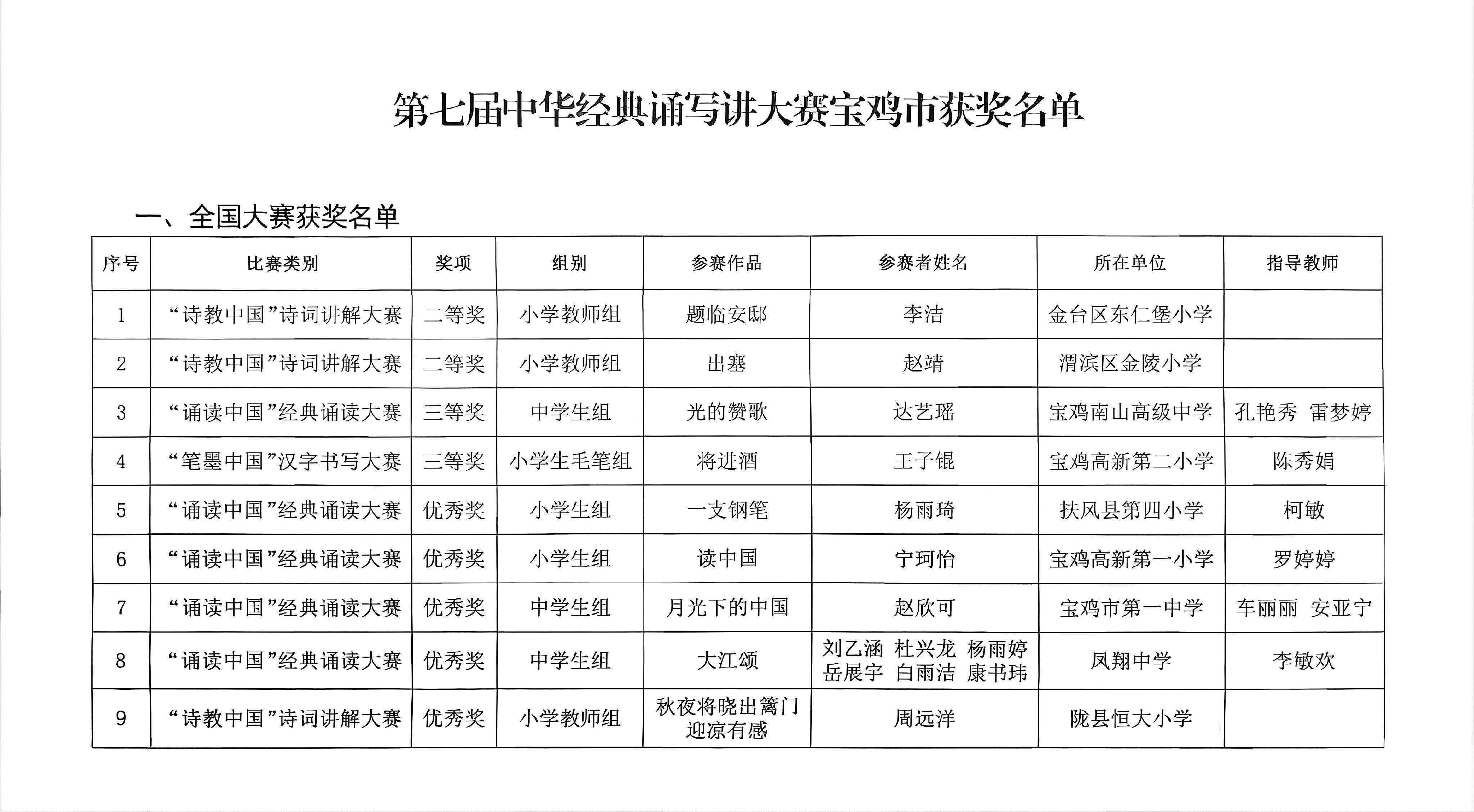 近日,教育部、陕西省教育厅相继公布第七届中华经典诵写讲大赛获奖名单。宝鸡参赛团队与个人表现突出,斩获国家级奖项9个、省级奖项67个,充分彰显了我市在传承中华优秀语言文化方面的扎实成效和师生的良好精神风貌。