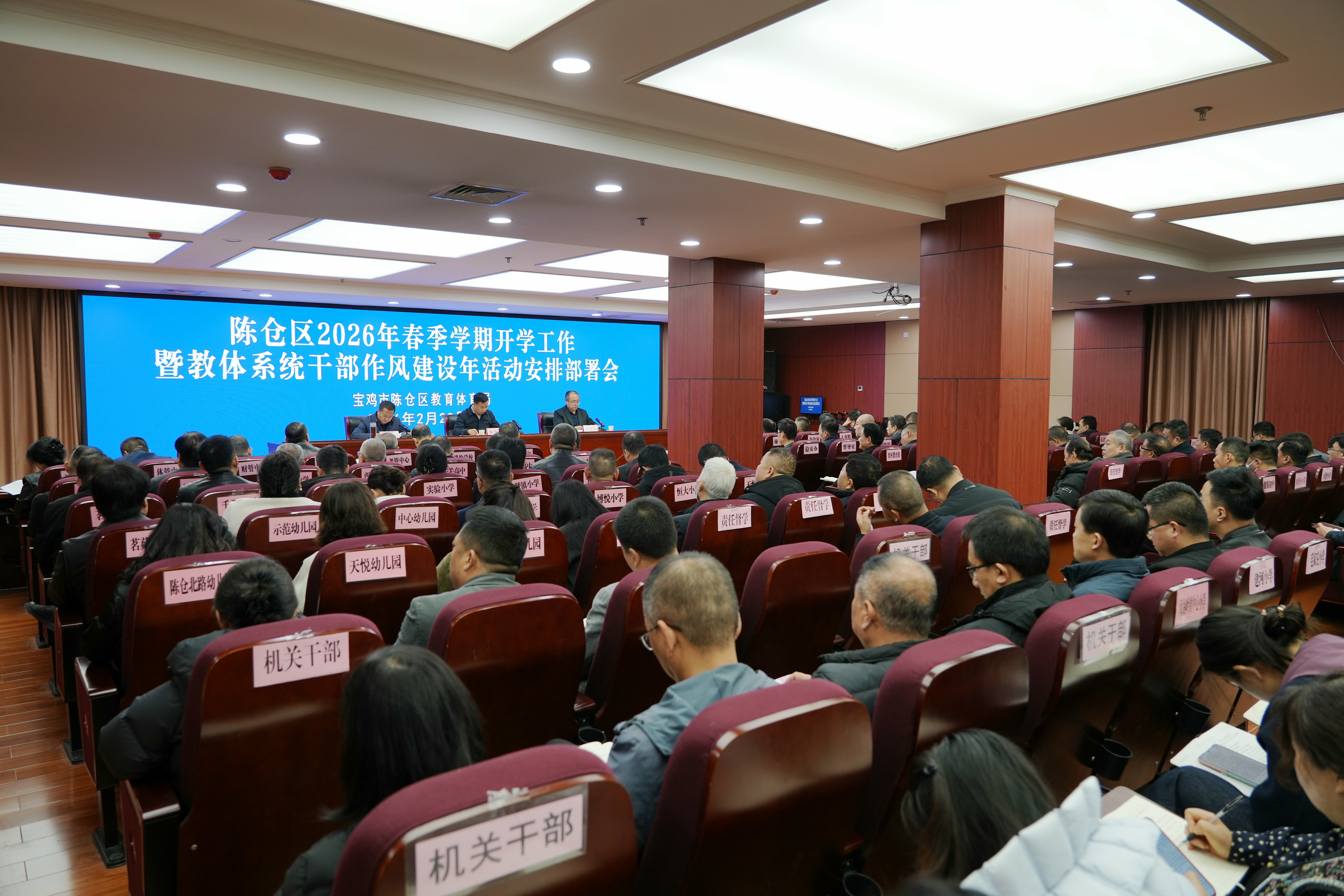 2月28日,陈仓区教体局召开2026年春季学期开学工作暨教体系统干部作风建设提升年活动安排部署会。会议深入学习习近平总书记关于教育的重要论述,传达学习全国及全省教育工作会议精神,认真回顾总结2025年工作得失,全面部署新学期各项工作,专题安排教体系统“守纪律、勇担当、优服务、提质效”干部作风建设提升年活动,动员全区教体系统干部职工以“开局即决战、起步即冲刺”的奋斗姿态,奋力推动教体事业发展开好局、起好步。局党组书记、局长李喜科参加会议并讲话。