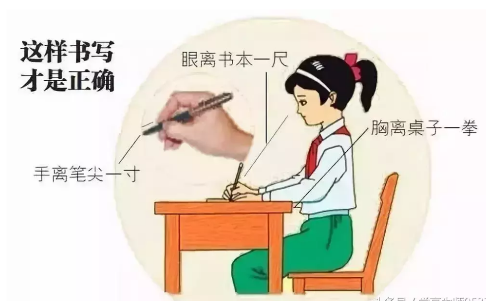 在读写时一定要牢记三个一:“一尺、一拳、一寸”,书写时胸距书桌一拳,眼距书本一尺(33厘米),指尖距笔尖1寸,坐姿端正,不可弯腰驼背。
