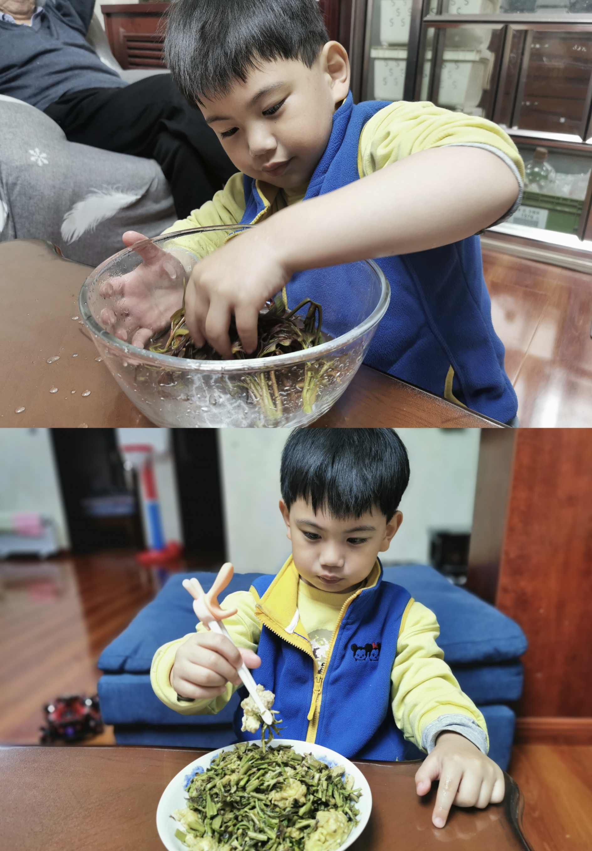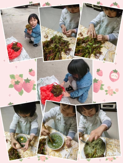 孩子们在家长的指导下,亲自动手择一择、搅一搅、烙一烙,不仅尝到自己的劳动成果,还品到了来自春天的美味。