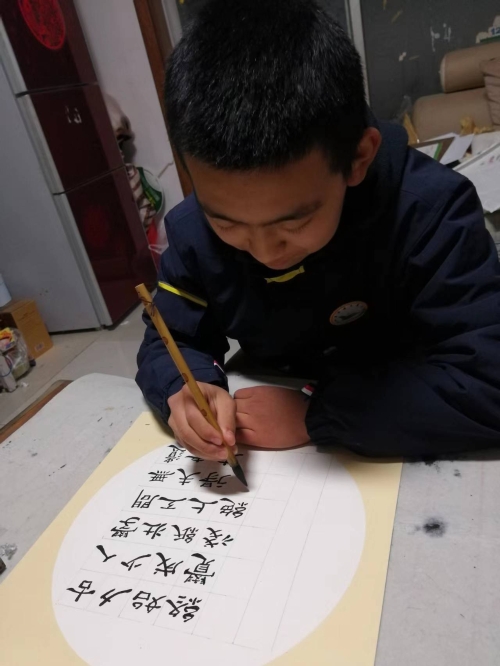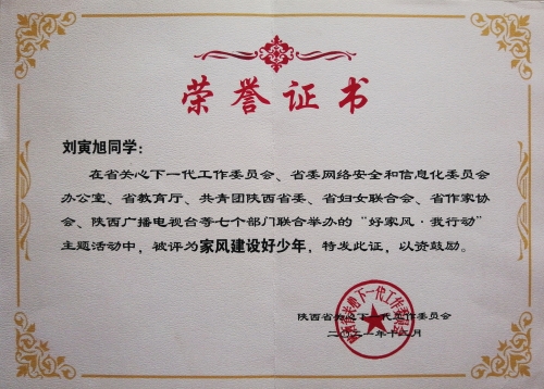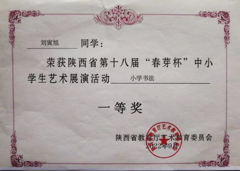 在爸爸的耳濡目染下他对书法、下象棋、朗诵等传统文化特别感兴趣,每天学习之余都要坚持写字下棋,既培养了他缜密的观察力和专注力,也养成了他做事认真、踏实严谨的习惯。目前,刘寅旭己获得硬笔书法和软笔书法五级考级证书。2022年9月,在陕西省第十八届“春芽杯〞中小学艺术展演活动荣获小学书法组一等奖。他还爱好阅读,善于写作,在小学期间多次被评为校园读书之星,多篇作文被当作范文在全班分享,并能积极参与各类征文比賽屡获佳奖。他还爱好朗诵,小学阶段多次担任校园红领巾广播员,为师生播送主题教育和励志故事,2021年5月在庆祝建党一百周年之际学校举行的系列活动中,他担任陇县西大街小学红领巾广播站“师生同讲党史”第六期主讲,赢得师生一致好评。