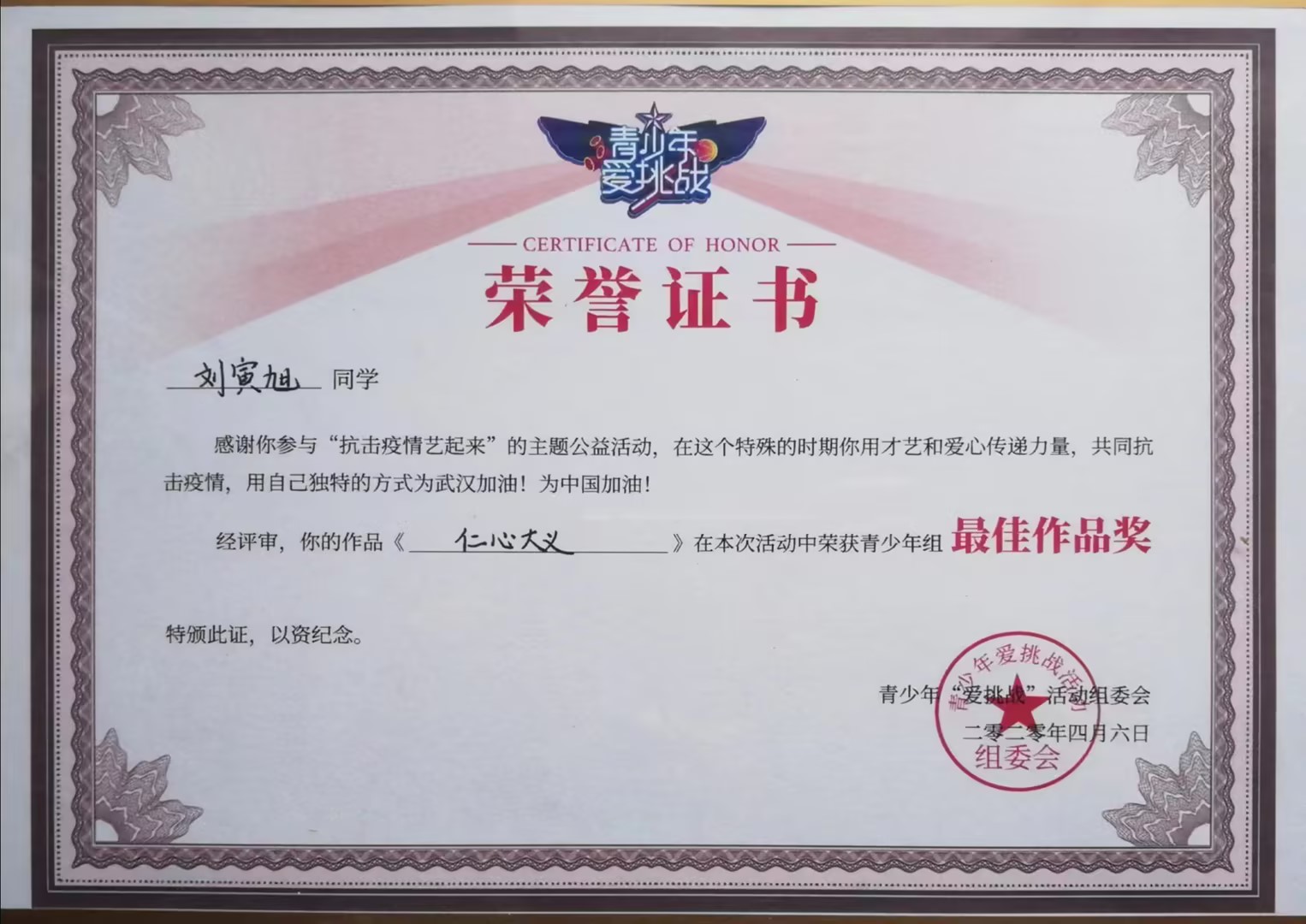 从小父母常对他说“赠人玫瑰,手有余香”,这个理念在他的幼小心灵播下了感恩的种子,伴随他一路向阳生长。2020年春天武汉遭遇了新冠病毒的侵袭,面对突如其来的疫情,他积极行动,每天收看新闻,及时了解疫情防控形势,学习抗疫英雄事迹,参与抗疫宣传,录制短视频防疫顺口溜,绘制十多幅抗疫题材的手抄报,他还积极参加“爱挑战·抗疫艺起来”活动,其书法作品获最佳作品奖,朗诵作品《你的样子》参加陕西省经典诵读网络大赛获优秀奖,以自己的实际行动支持抗疫,致敬英雄。2022年春天家乡陇县再次遭遇新冠病毒侵袭,他积极撰写抗疫作文和书写抗疫书法作品宣传抗疫英雄事迹,尤其是他写的作文《人间自有真情在,众心灼灼护国安》并配音朗诵在陇县西大街小学学校公众号发布,赢得广泛赞誉。在一中他还积极参与校园文明监督岗志愿行动,引领身边的同学向文明看齐、做环保小卫士,带头捡拾校园垃圾,擦洗楼道栏杆污渍,监督不文明行为,还深入附近社区志愿服务,打扫卫生,关爱空巢老人等。星光不问赶路人,时光不负有心人。他不仅学会了分享与感恩,还懂得了承担社会责任、提升自我价值。他深信只有现在好好学习,从小练就过硬本领,将来才能像白衣战士和革命烈士那样冲锋陷阵,为国家和人民贡献力量。