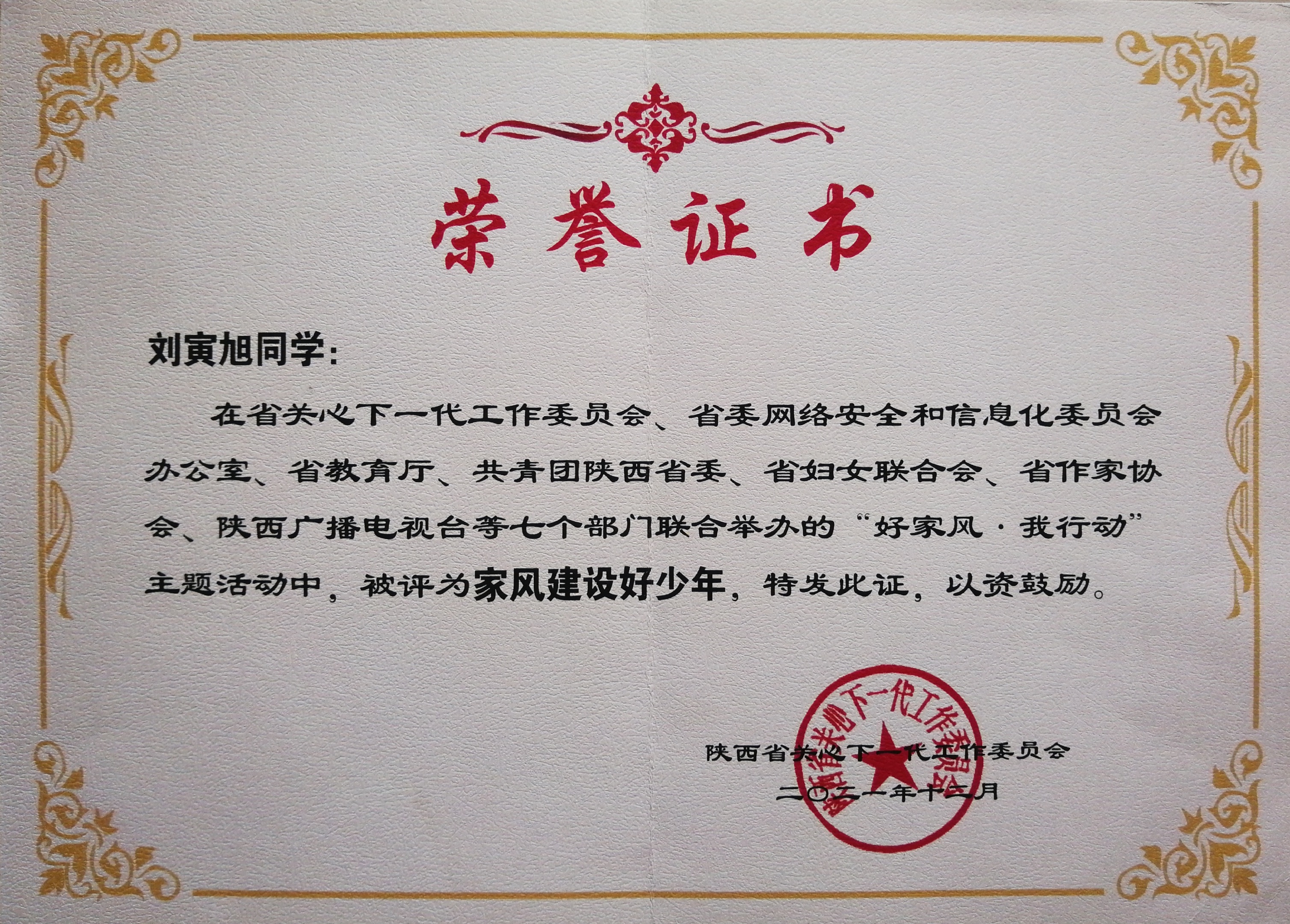 “百善孝为先,尽孝无底线”是爷爷常说的话。出身家庭并不富裕的他,从小懂得自立自强、孝亲敬老。打扫卫生,收拾房问是他周末的必修课;自己的事自己做,今日事今日毕是他的座右铭。还经常帮父母做力所能及的家务,洗衣服、扫地、买菜等等,还经常为爷爷奶奶端茶、倒水、喂药、量血压等,给他们讲新闻、说笑话,逗得一家人乐呵呵,是家里的“开心果”,每逢长辈们的生日,他都会精心制作贺卡送给长辈,表达自己的感恩之情。在父母的教育下,他深深的懂得在餐桌上不能先动筷子,在与长辈交谈时,语气温和,长辈有呼必应,不顶撞父母,每次上学回家主动向长辈问好...在缕缕家风的吹拂下,他们这个大家庭总是井然有序,和谐温馨。2021年12月在省关工委、省教育厅、共青团陕西省委等七部门联合举办的“好家风、我行动”主题活动中,被评为“家风建设好少年”。