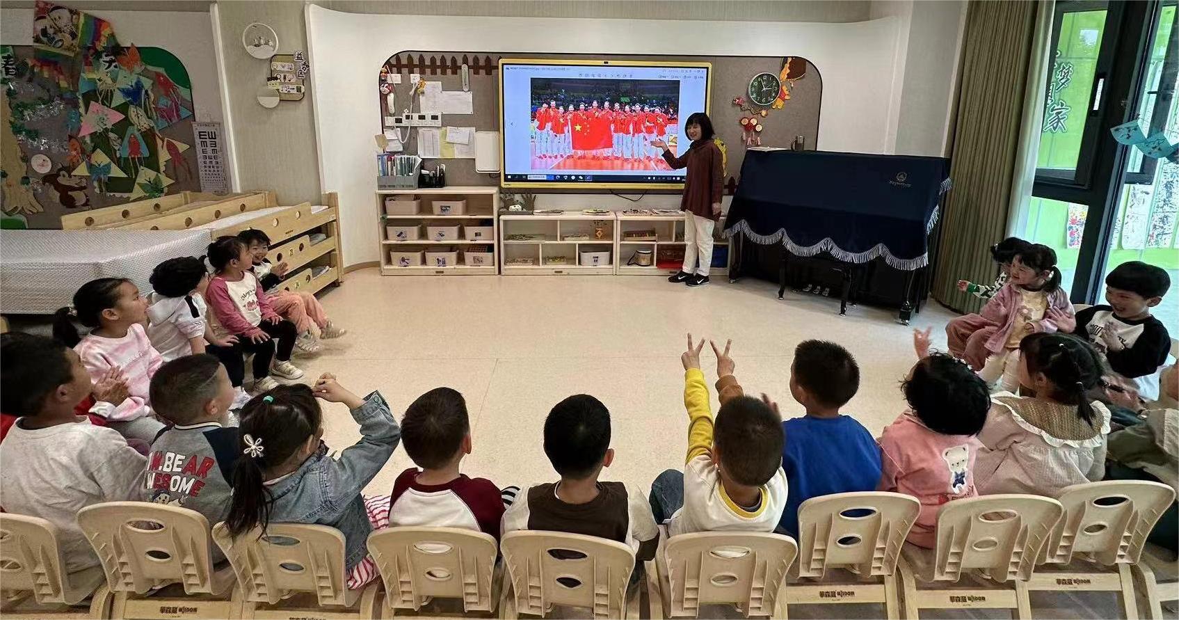 孩子们观看中国女排,感受勇敢、顽强、胜不骄,败不馁、摔倒了爬起来的运动精神,热火朝天的讨论着自己心中的运动精神。