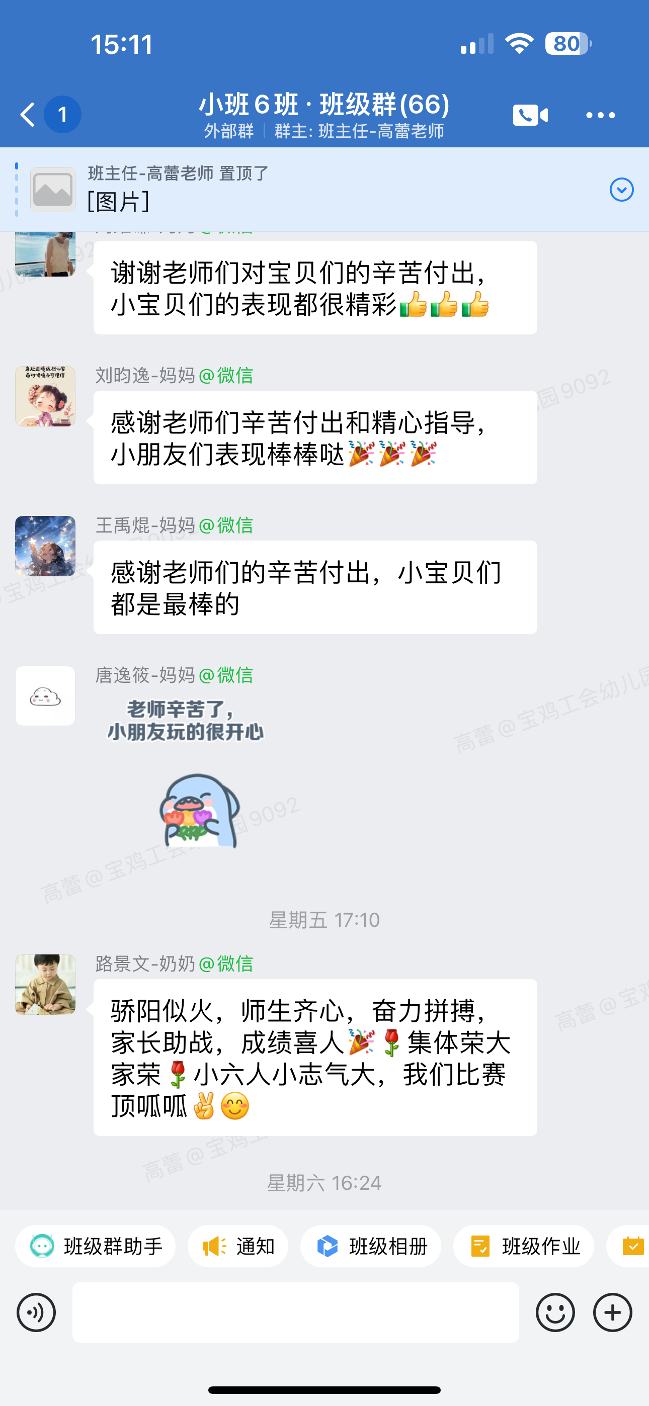 蔡海娟老师:美好的时光总是短暂的,运动会伴随着孩子们的笑声与欢呼声圆满结束了。亲子运动会对孩子们而言,是温暖,是陪伴,是关爱;对家长们而言,是见证孩子们健康成长的蜕变。对我们老师而言,是记录孩子们在练习过程中的美好。孩子们在运动中学会成长与收获,在运动中感受家长的爱与陪伴。在运动中发展动作的协调性与可贵的运动精神。小小运动员,在赛场上各个都是勇敢、自信、坚强。挥洒汗水,收获快乐。未来,我们会继续行动起来,家园同步、携手并进,让运动点亮童心、愉悦身心,使每个孩子绽放精彩!