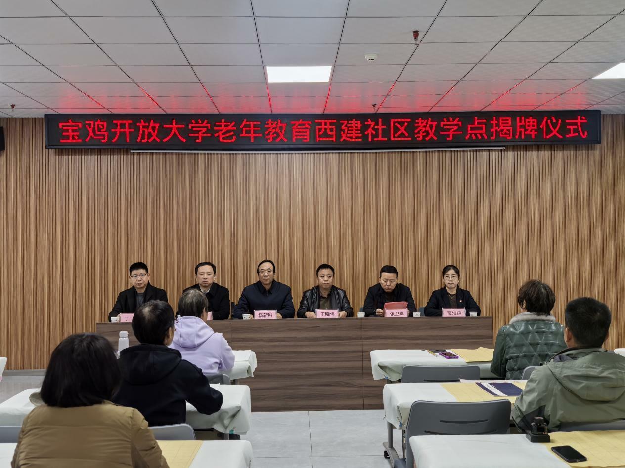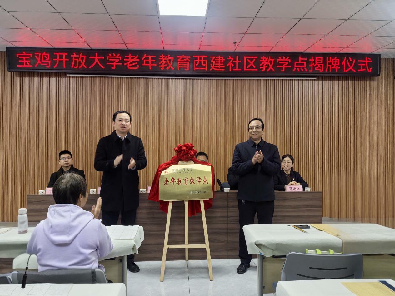宝鸡开放大学党委书记、校长杨新科,金台区委社会工作部部长刘波共同为“宝鸡开放大学老年教育西建社区教学点”揭牌。
