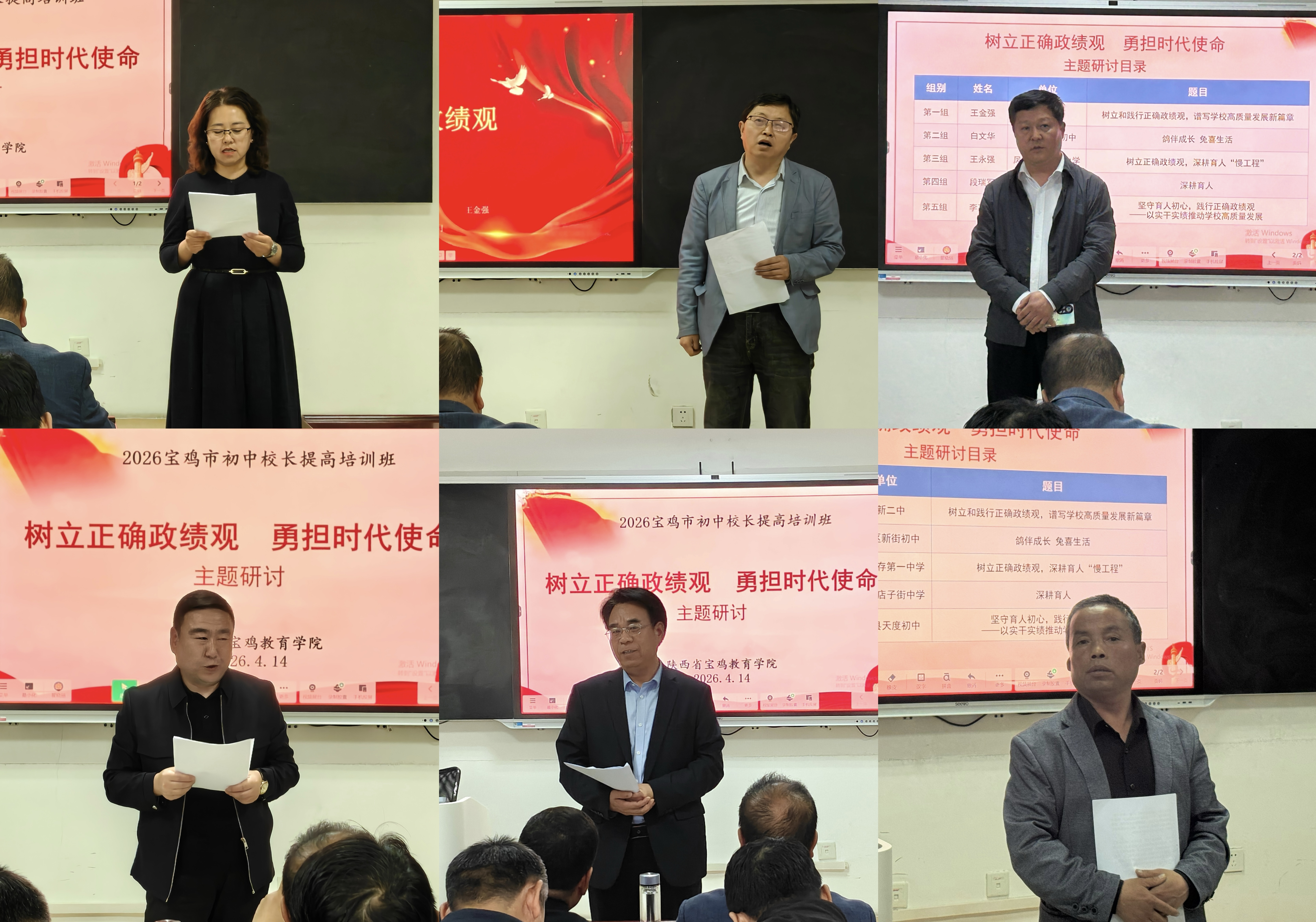 4月14日下午,培训班紧扣“树立正确政绩观,勇担时代使命”核心主题,精心组织开展专题研讨,活动由班级临时党支部书记翟晓丽主持。此次研讨以践行正确政绩观为根本导向,紧扣教育发展初心、聚焦办学治校关键,紧扣初中教育高质量发展核心需求,为各位校长交流政绩观实践经验、凝聚育人共识搭建了坚实平台,有效推动正确政绩观入脑入心、落地生根,切实引导各位校长把正确政绩观贯穿办学治校全过程、各方面。各组代表依次发言:高新二中王金强分享践行正确政绩观的思路;陈仓新街初中白文华以“鸽伴成长,兔喜生活”实践彰显育人初心;凤翔竞存一中王永强探讨深耕育人“慢工程”的路径;金台店子街中学段瑞军阐述涵养长远政绩理念;扶风天度初中李高林交流实干促发展的做法,分享宝贵经验。各位代表的发言既有理论思考,又有实践支撑,为全市初中教育高质量发展提供了有益借鉴。