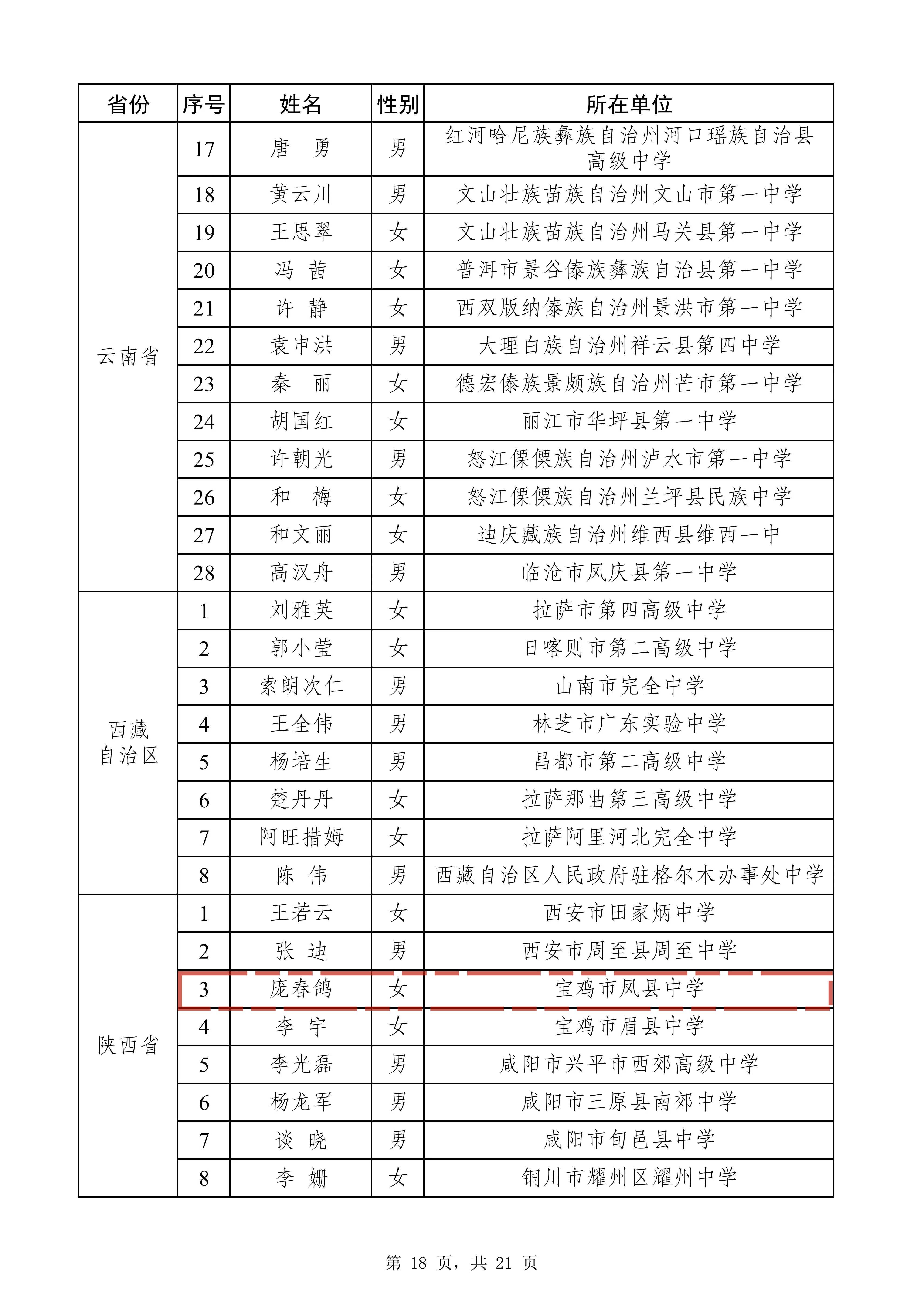 近日,教育部印发《关于公布全国县域普通高中头雁教师岗位计划人选的通知》,凤县中学英语教师庞春鸽成功入选首批计划。本次陕西省共16人入选,宝鸡地区仅2人。