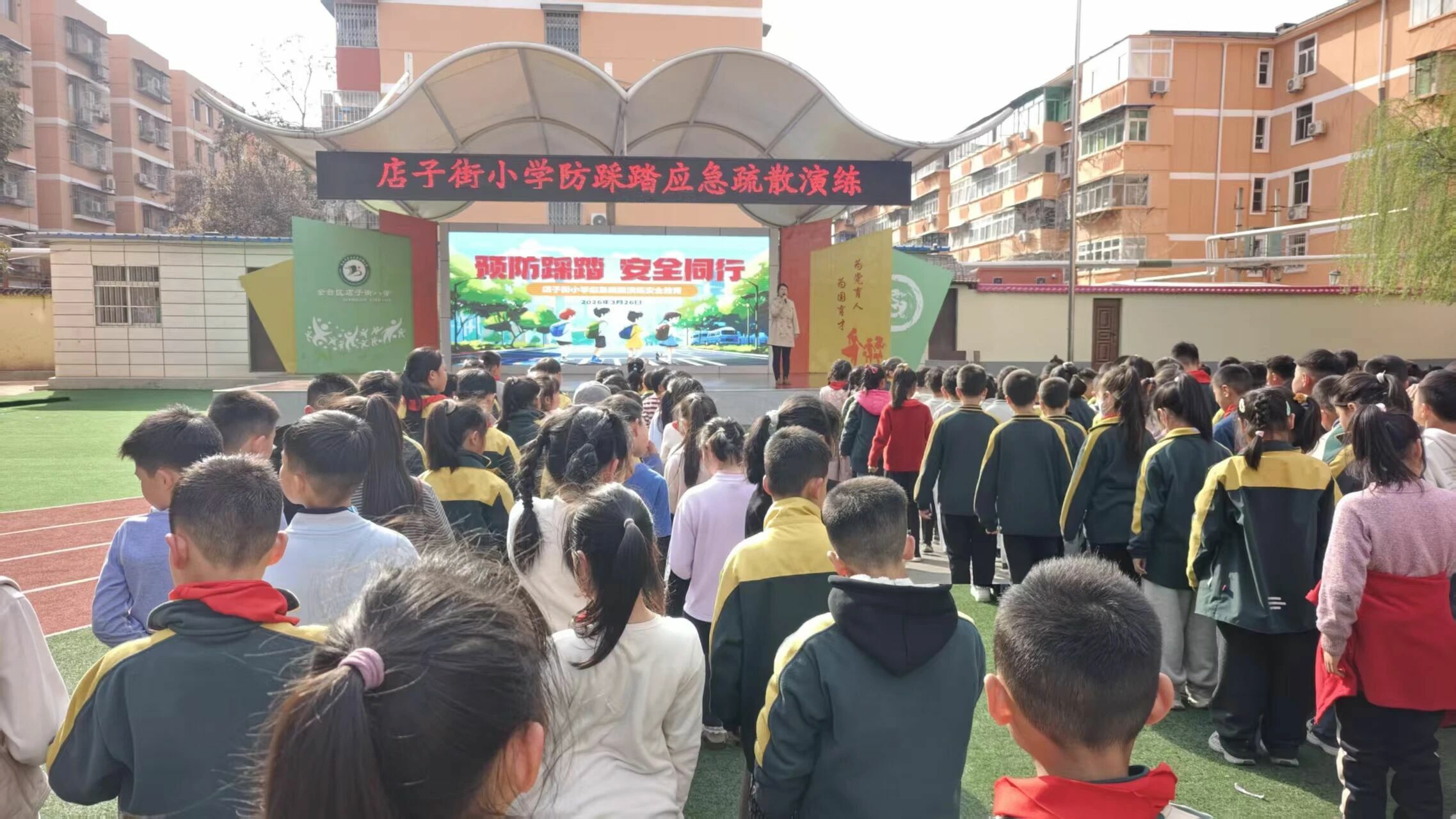 3月26日,店子街小学聚焦防踩踏风险开展专项演练。信号发出后,学生在教师引导下,严格遵循弯腰扶墙、有序下楼规范,楼道各岗位教师全程疏导疏导,严防拥挤停留。短短数分钟,全体师生安全集结操场。德育主任现场强调“安全无小事,时刻记心间”,明确将常态化强化日常巡查与演练,让安全意识深植师生心底。