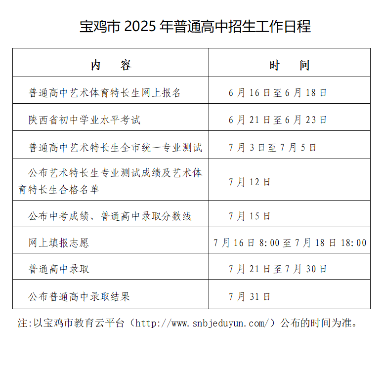 宝鸡市2025年普通高中招生工作日程