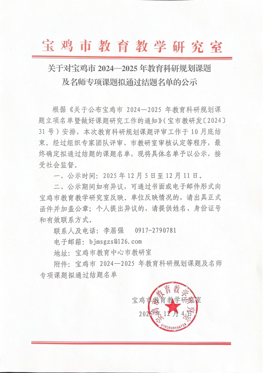 关于对宝鸡市2024年—2025年教育科研规划课题及名师专项课题拟通过结题名单的公示