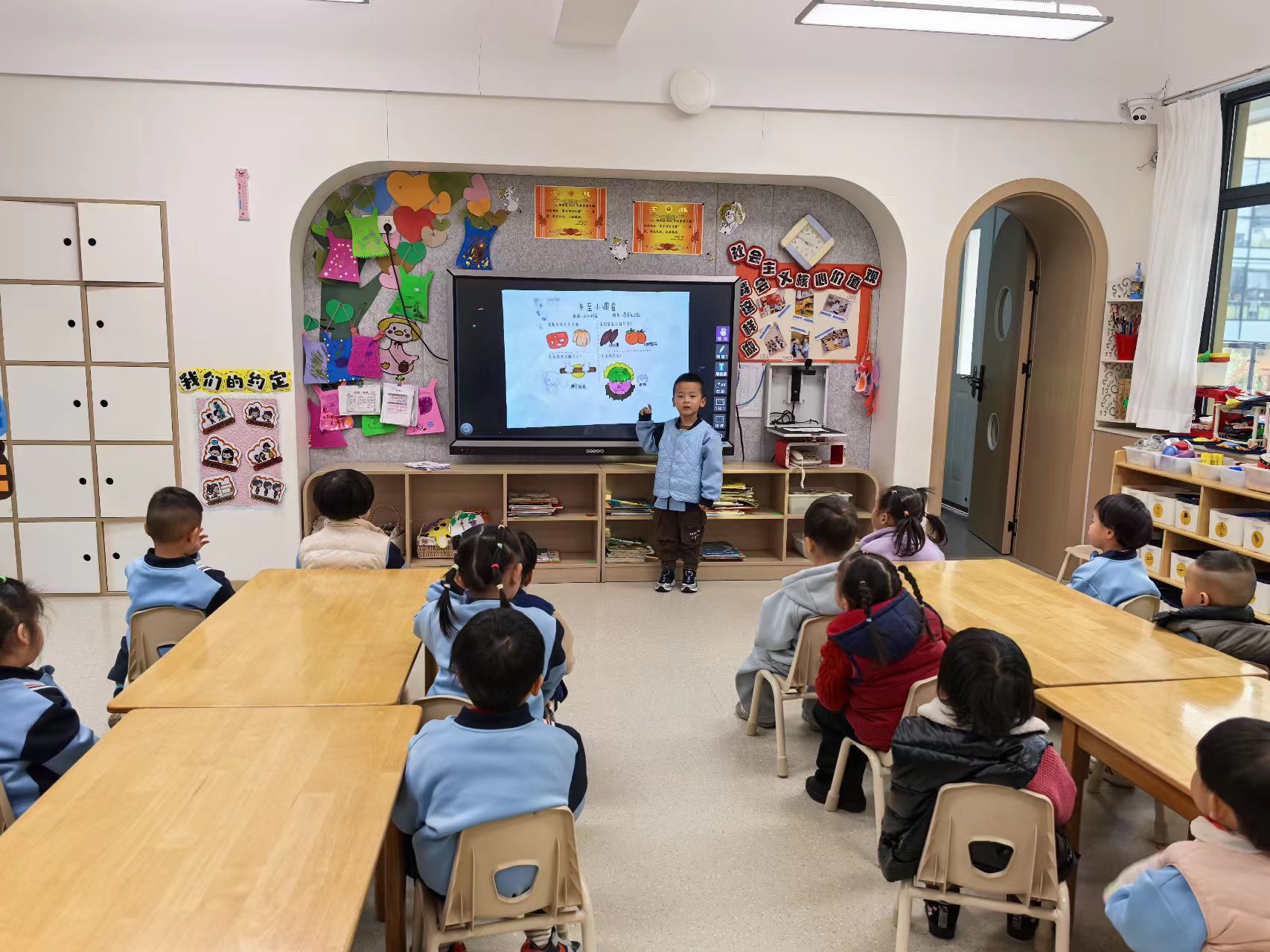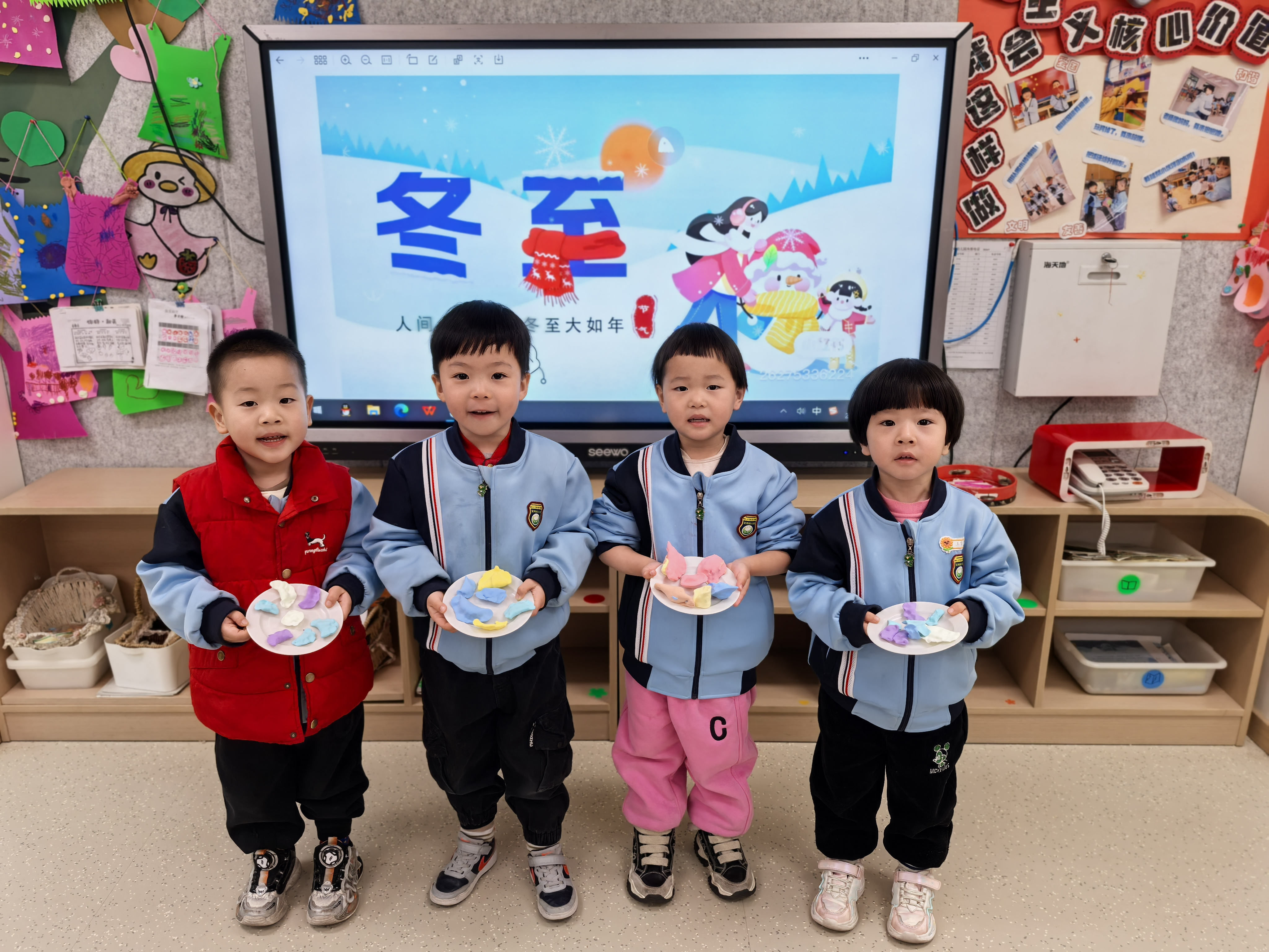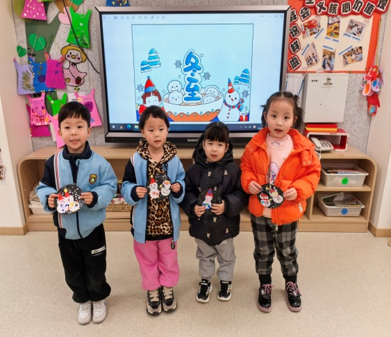通过冬至小调查、主题分享会、亲子共读、绘本故事等,孩子们了解到冬至又称数九、亚岁,自古被视为冬季的大节气,重要性仅次于除夕,是二十四节气中最早被制定的一个节气。它是冬天真正开始的日子,也是全年中白天最短、黑夜最长的一天。