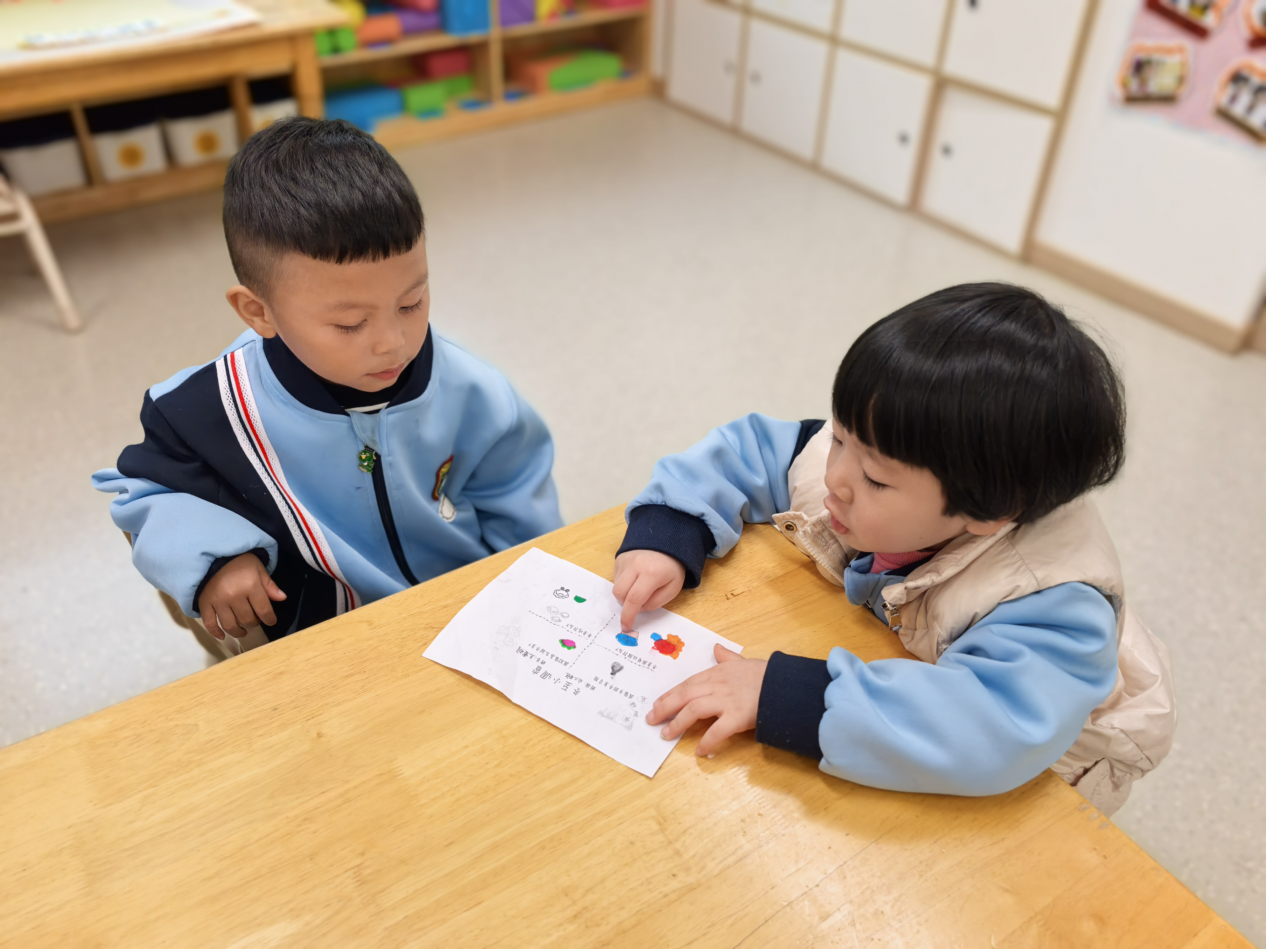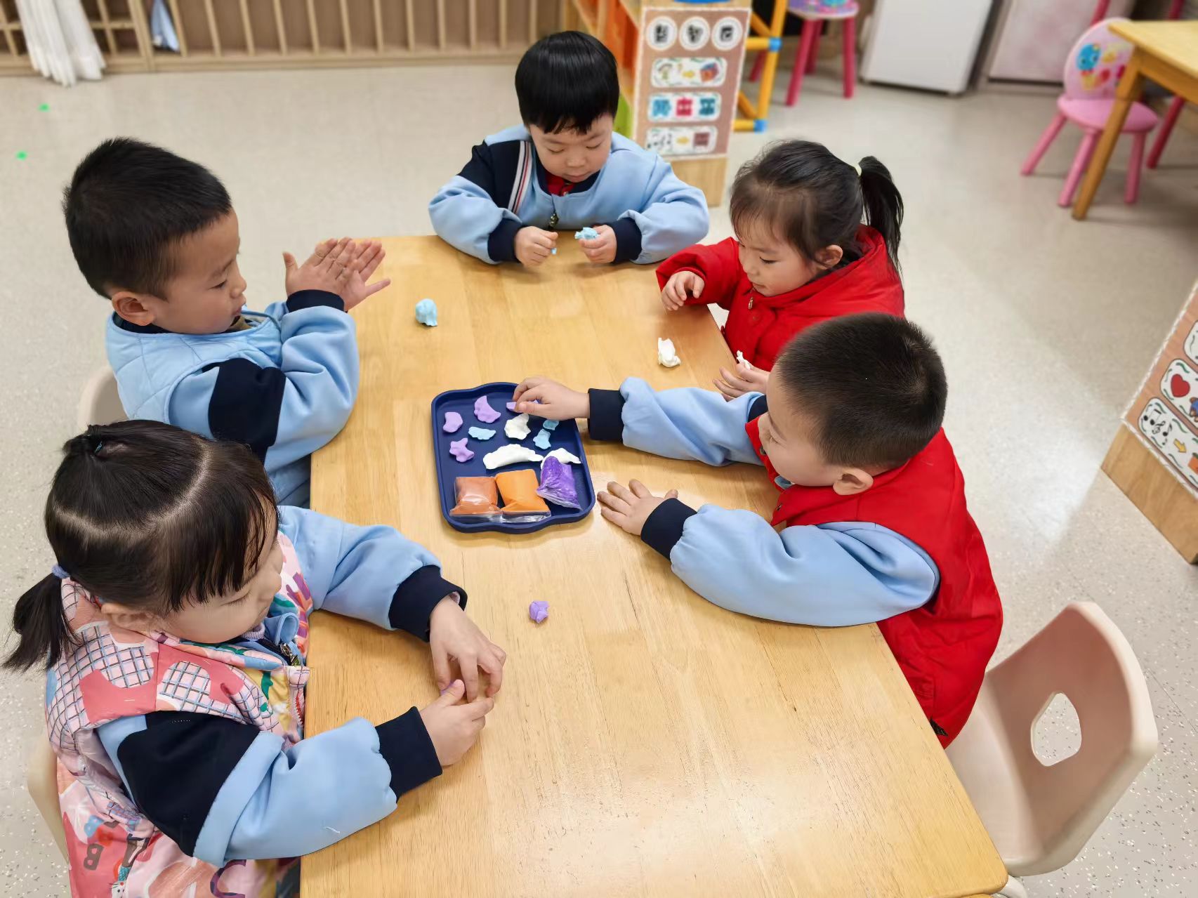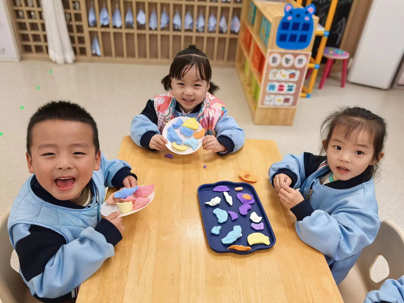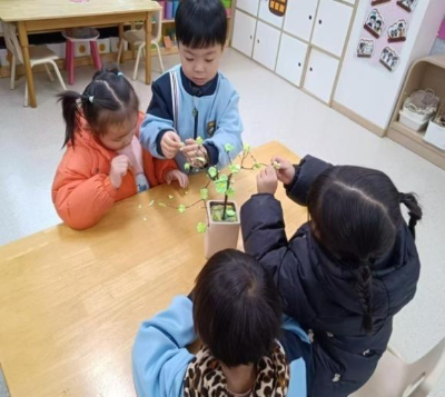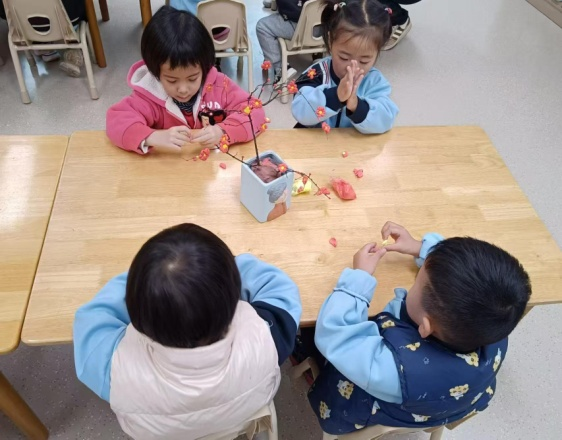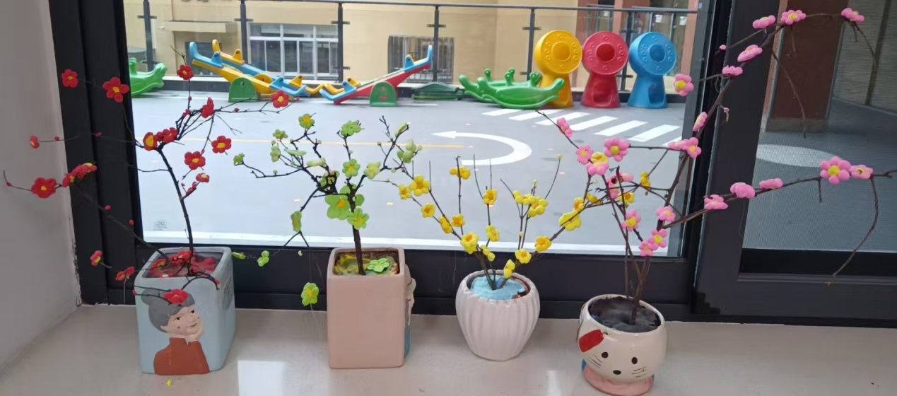 梅须逊雪三分白,雪却输梅一段香。看孩子们用泡泡泥让枝头开出朵朵梅花,似乎飘出了淡淡的清香。