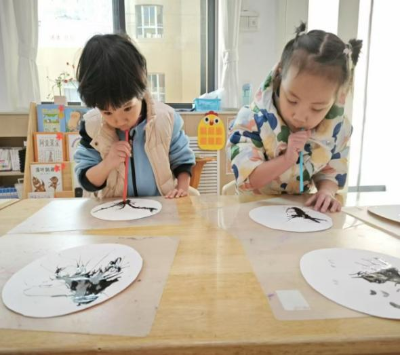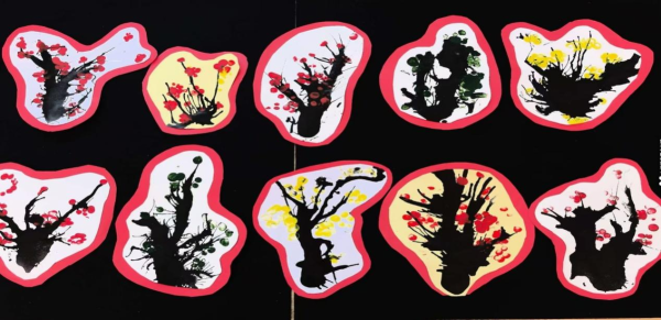 画一枝素梅,枝上开出梅花九朵,俗称九九消寒图,孩子们用吹墨点画的形式绘制出一枝枝寒梅,感受冬天独特的美景。