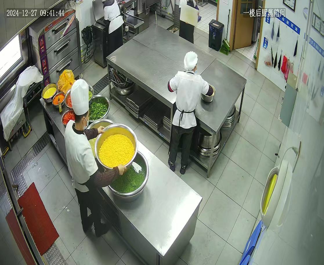 12月27日临近中午,眉县槐芽初级中学的餐厅后厨,食堂从业人员正抓紧时间洗菜、配菜、烹饪,他们的一举一动都被摄像设备记录并实时传输到眉县“互联网+明厨亮灶”系统上。