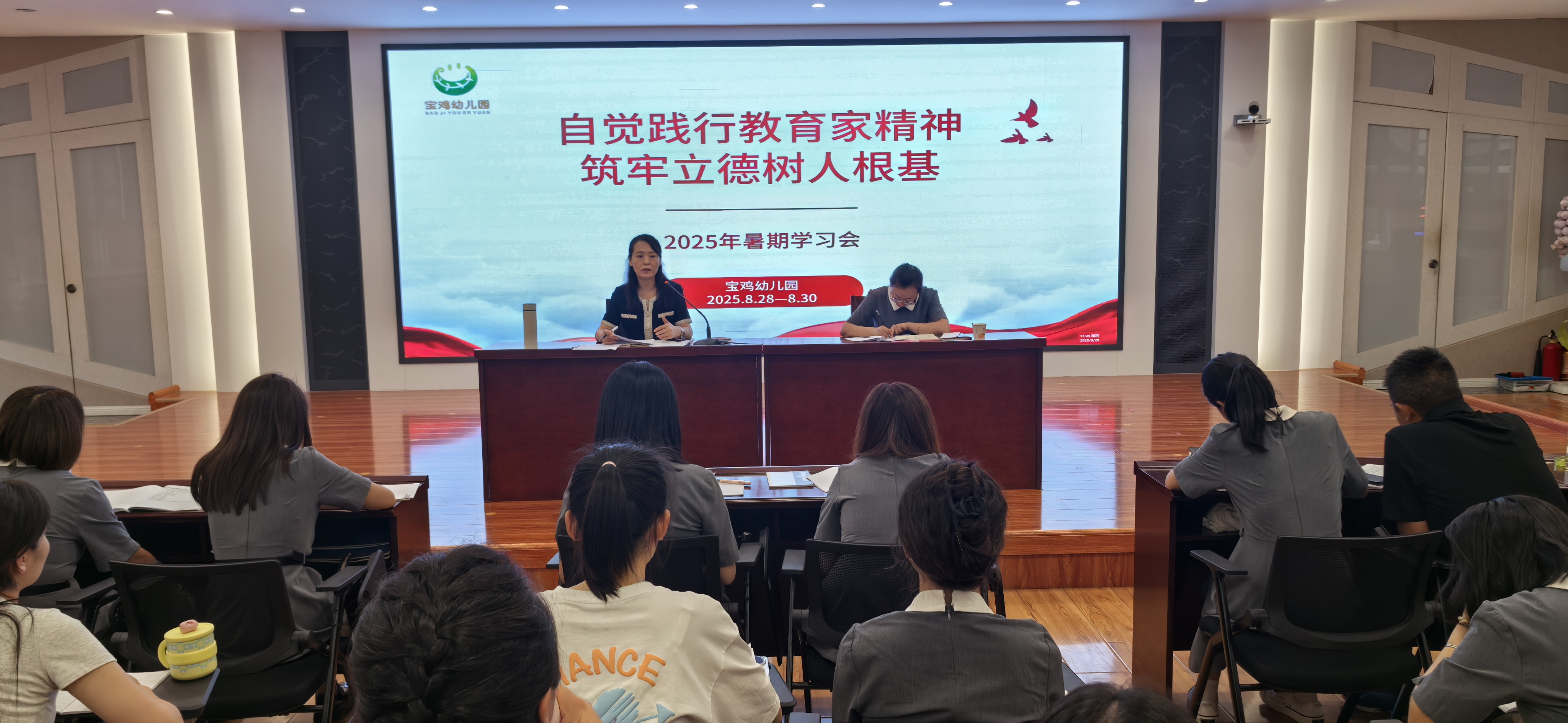 为深入学习贯彻习近平总书记关于教育事业和教师队伍建设的重要指示精神,全面落实立德树人根本任务,8月27日,宝鸡幼儿园2025年暑期教师学习会在热烈的氛围中正式拉开帷幕。本次学习会以“自觉践行教育家精神、筑牢立德树人根基”为主题,紧扣为党育人、为国育才初心使命,通过理论铸魂、专题报告、榜样引领等多元形式,组织全园教师开展为期三天的集中学习,全力推动教育家精神在园所落地生根,为建设“全省一流名园”注入强劲动能。