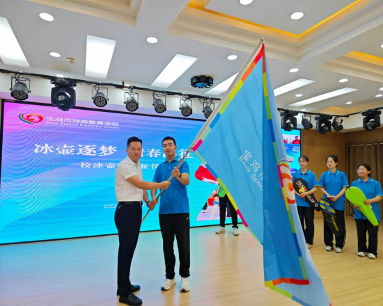 专职副书记李剑威为冰壶队授校旗