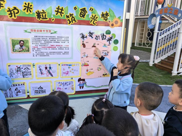 同时,教师借助绘本《一粒种子改变世界》,生动讲述袁隆平院士与杂交水稻的故事,带领孩子们走进一粒米的“生命旅程”。从播种、生长到收割、加工,孩子们在图文并茂的讲述中,理解了粮食的来之不易,也在心中种下了“一粥一饭,当思来处不易”的种子。