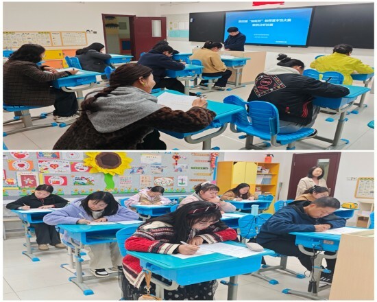 特教理论考试考场内鸦雀无声,参赛教师们凝神聚力、认真作答,充分展现出良好的纪律素养与专业态度。本次考试采用闭卷形式,题目设计兼具“基础记忆”与“理解应用”,从多维度、全方位考察教师对特教理论知识的掌握深度与灵活运用的熟练度,切实以考试为抓手,推动教师查漏补缺、深化专业学习。