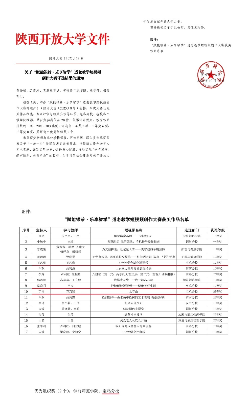 近日,陕西开放大学“赋能银龄・乐享智学”适老学习短视频创作大赛评选结果揭晓,宝鸡开放大学凭借优质作品与优秀组织能力,获得2个二等奖、1个三等奖及“优秀组织奖”共4项荣誉。