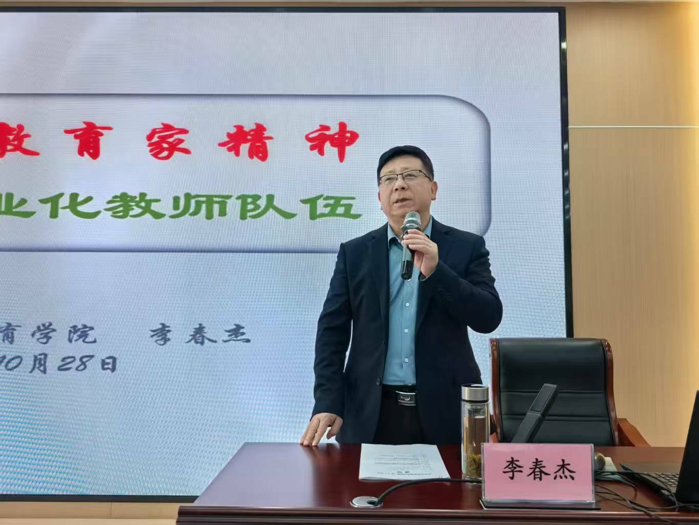 开班典礼后,李春杰院长围绕教育家精神的价值意蕴和内涵、加强新时代教师队伍建设、落实立德树人的根本任务为主题作了《弘扬教育家精神 建设高质量专业化教师队伍》的主旨报告。