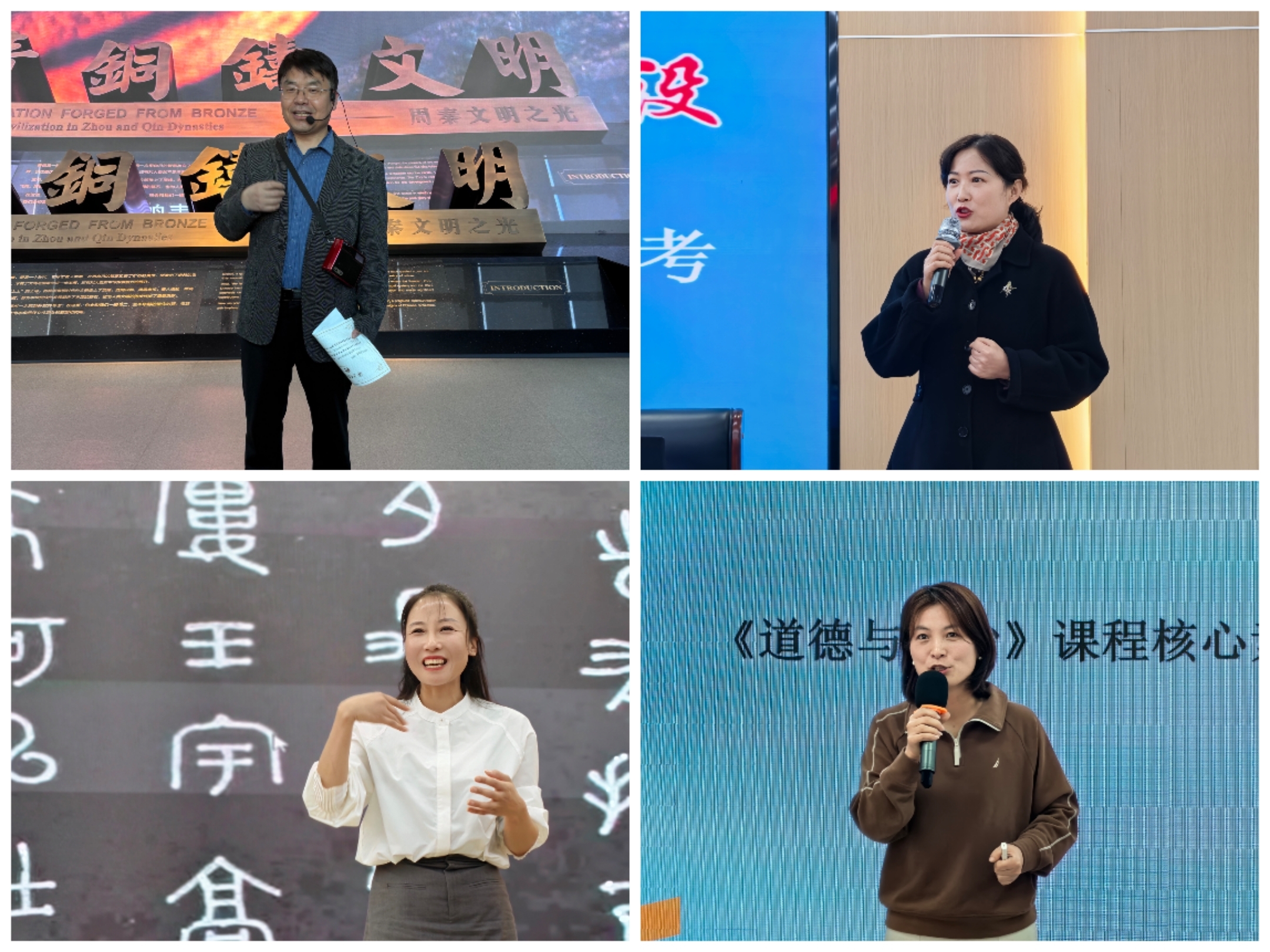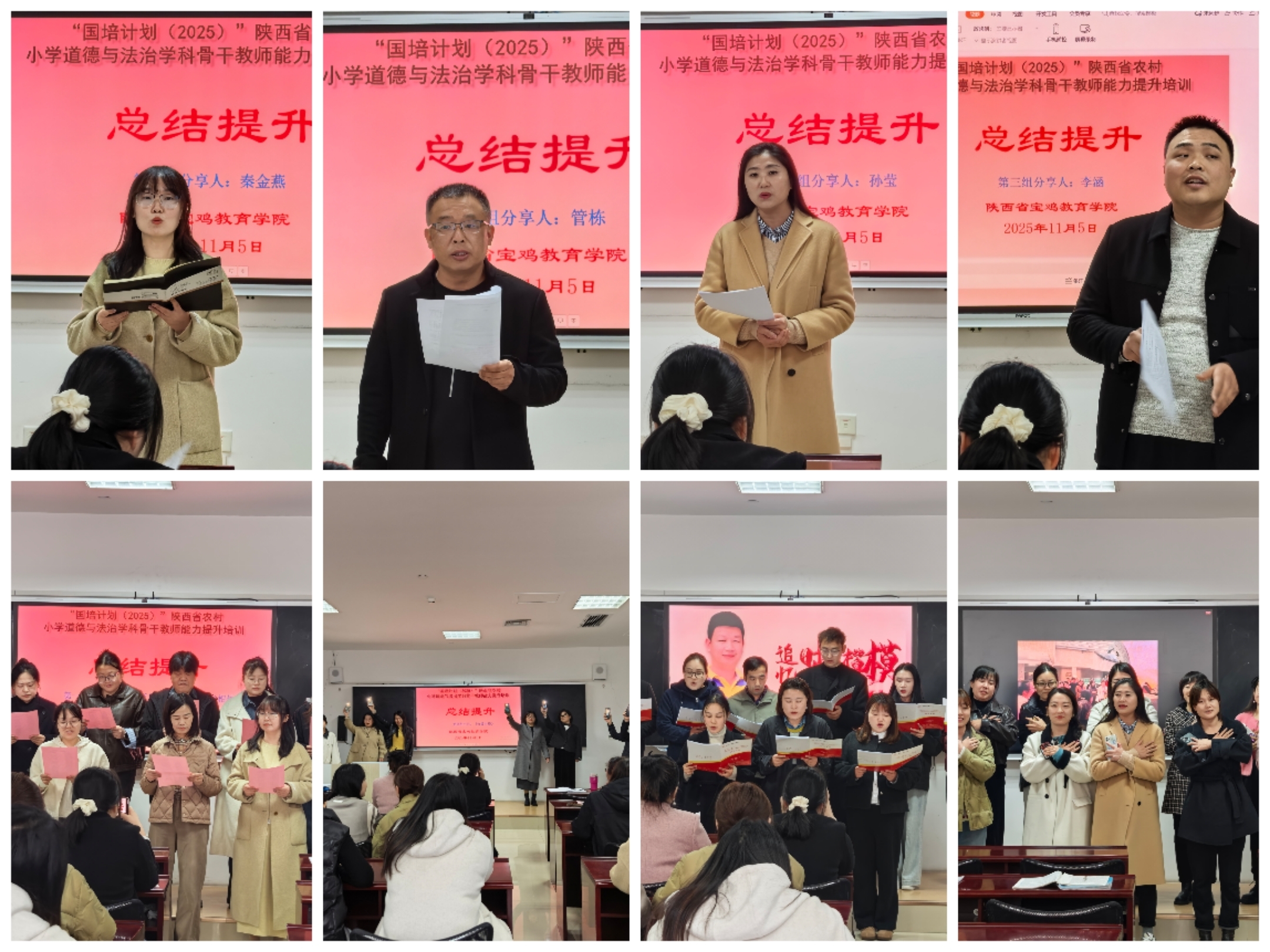 “独行快,众行远。”本次培训聚焦互助共学,搭建协作互动平台,通过主题班会、文化研学、总结展示等多元创新活动,凝聚成长合力,激发学员活力,切实落实培训实效。主题班会中,学员们通过自我展示、小组交流深化互动,组建紧密的学习共同体,既激发了内在学习动力,又增强了团队凝聚力,为后续协作学习筑牢基础。文化研学以“行走的思政课”形式开展,参训教师走进宝鸡青铜器博物院,在宝鸡文理学院冯盛国教授的现场讲解下,近距离观察珍贵青铜器物,深入感悟陕西深厚历史文化底蕴,尤其领会了青铜文明中“礼”“德”“法”的思想内核,为今后将地方文化资源融入道德与法治课堂、丰富教学内容拓宽了思路。总结展示环节,各学习共同体先开展组内交流,分享学习收获与感悟并推选优秀代表进行全班汇报。学员们还利用课余时间精心排演节目,以诗歌创作回顾学习之旅,用红歌串烧抒发教育情怀,全员参与的展演活动既展现了培训成果,又让每位教师在互动中收获成就感。这一系列活动不仅让温暖与智慧在交流中传递,更有效凝聚了团队力量,为参训教师赋能增效,助力大家将学习成果转化为教学实践。