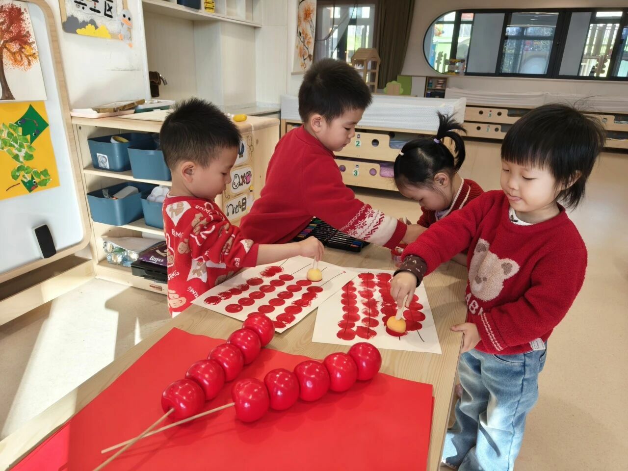 拓印活动中,孩子们屏息凝神,当鲜红的“福”字跃然纸上,一张张小脸上绽放出惊喜的光彩;另一边,手工糖葫芦制作热火朝天,一颗颗“山楂”串起甜蜜,映衬着张张笑脸,甜到了心坎里。