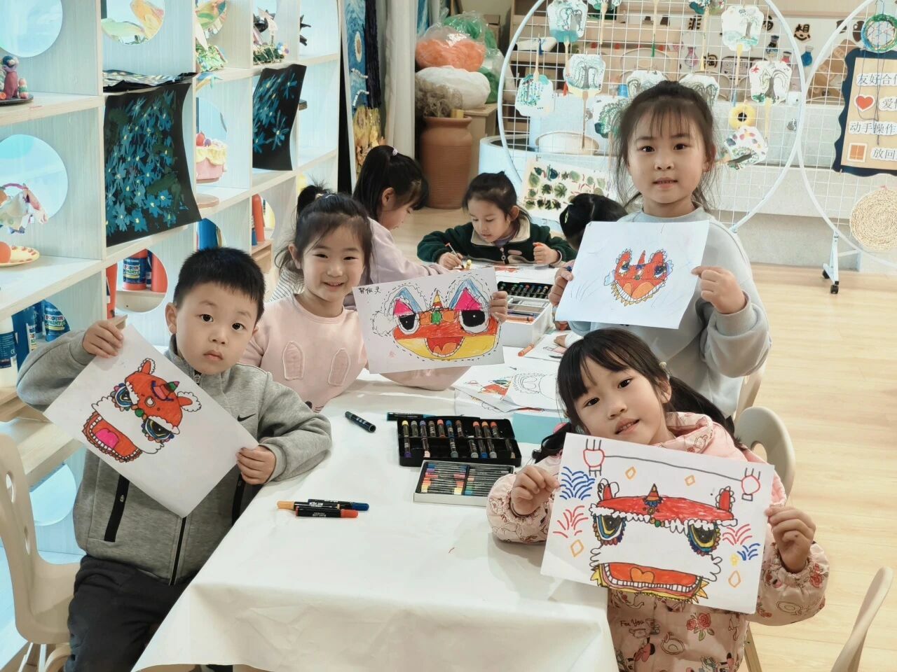 饺子、麻花、汤圆、面条… 一桌丰盛的“年夜饭”在孩子们手中逐渐成形,一旁的画纸上,色彩鲜艳的醒狮也在稚嫩笔触下鲜活起来,红的绒球、金的纹路,每一笔都藏着对新年的热闹期盼,在制作美食与描绘醒狮的过程中,既感受了团圆饭的温馨与传统文化的烟火气,更在动手实践里触摸到了年俗里的热闹与欢喜。