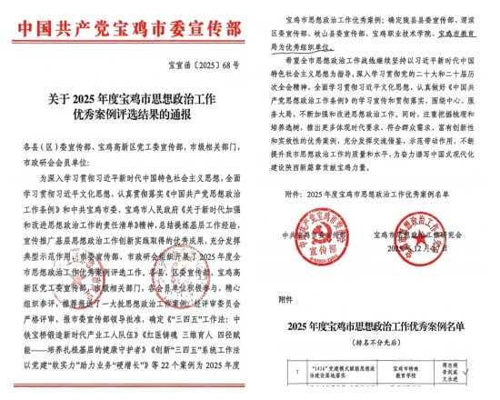 近日,中共宝鸡市委宣传部、宝鸡市思想政治工作研究会联合印发《关于2025年度宝鸡市思想政治工作优秀案例评选结果的通报》,市特教学校《“1416”党建模式赋能思想政治建设落地落实》案例凭借鲜明的创新性、扎实的实践成效和突出的示范价值,成功入选2025年度宝鸡市思想政治工作优秀案例,成为全市教育系统思想政治工作的标杆典范之一。