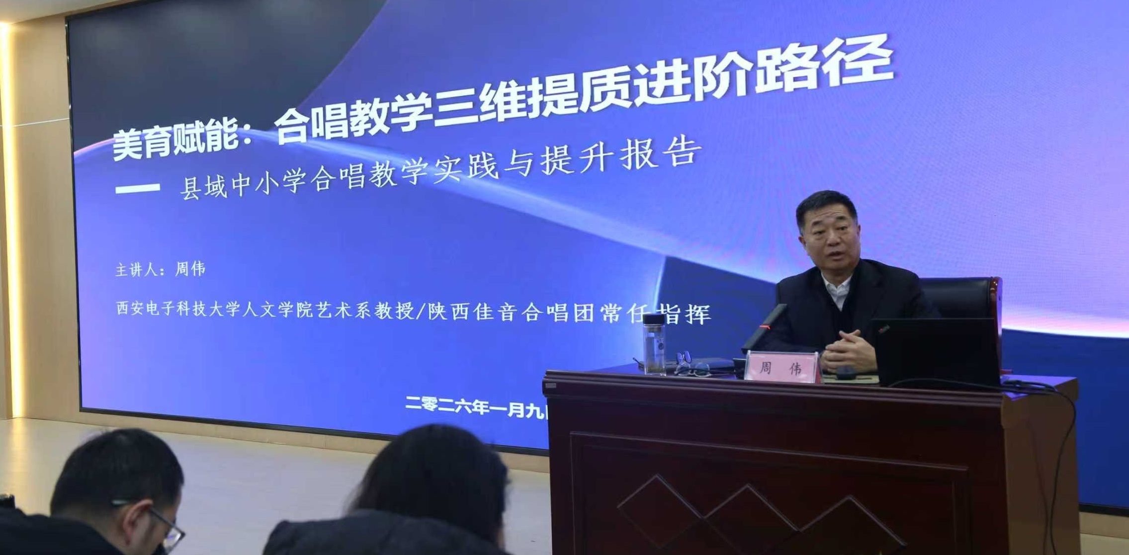 活动分为专题报告、教学观摩、点评深化三大环节,分别在宝鸡市教育中心、宝鸡实验小学、宝鸡市姜城中学有序开展。上午的专题报告环节,西安电子科技大学周伟教授以《美育赋能:合唱教学三维提质进阶路径》为题,从时代价值、审美建构、实操路径、专业进阶到县域适配等五个维度的分享,勾勒出合唱教学发展的完整图景,让参训教师对如何做好新时代合唱教学工作有了更清晰的认知;渭南市教育研究所特级教师邓涛带来《核心素养背景下美术教师专业发展策略》分享,围绕“核心素养如何落地美术课堂”这一核心问题,从“美术教师专业发展的时代趋势”“新时代美术教师应该是怎样的”“实现美术教师专业成长的路径和策略”三方面,为美术教师的职业成长与课堂创新进行了系统指引。